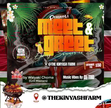 Join us for an unforgettable meet and greet at Kinyash Farm featuring BBQ, nyama choma, dance music, and a cozy bonfire.